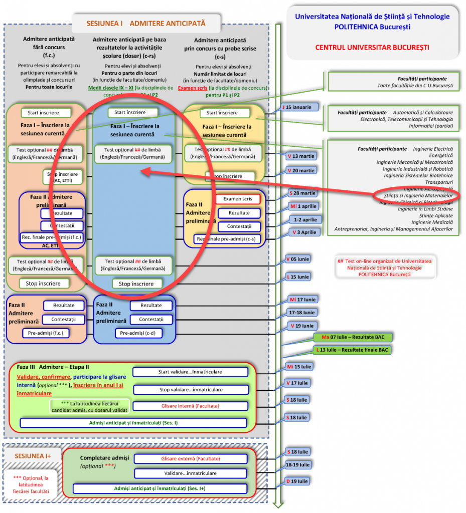 În cadrul Sesiunii I – Admitere anticipată există 3 faze cu desfășurare succesivă – Înscriere, Admitere preliminară, Validare, confirmare, înscriere în anul I și înmatriculare admiși anticipat, după cum urmează: