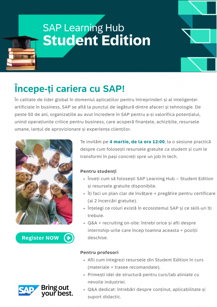 În data de 4 Martie 2026, cu incepere de la ora 12.00, in cadrul Aulei Politehnica Bucuresti, experti SAP vor sustine o prezentare dedicata platformei SAP Learning Hub – Student Edition. Evenimentul se adreseaza atat studentilor, cat si cadrelor didactice si are ca obiectiv cresterea gradului de informare si utilizare a resurselor educationale oferite prin parteneriatul SAP Academic Partnership (fosta denumire SAP University Alliance).